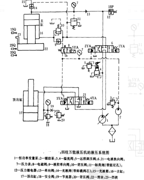 5、最后主缸停止時的狀態(tài) ,當(dāng)主缸滑塊上的鐵23按下沖程開關(guān)1SQ時,電磁鐵2YA被切斷,主缸活塞被位于M功能中心的閥門6鎖定,停止運(yùn)動,返回行程結(jié)束。此時,泵1油通過閥門6,閥門21返回油箱,泵處于卸載狀態(tài)。在實(shí)際使用中,主汽缸可以在任何時候停下來。